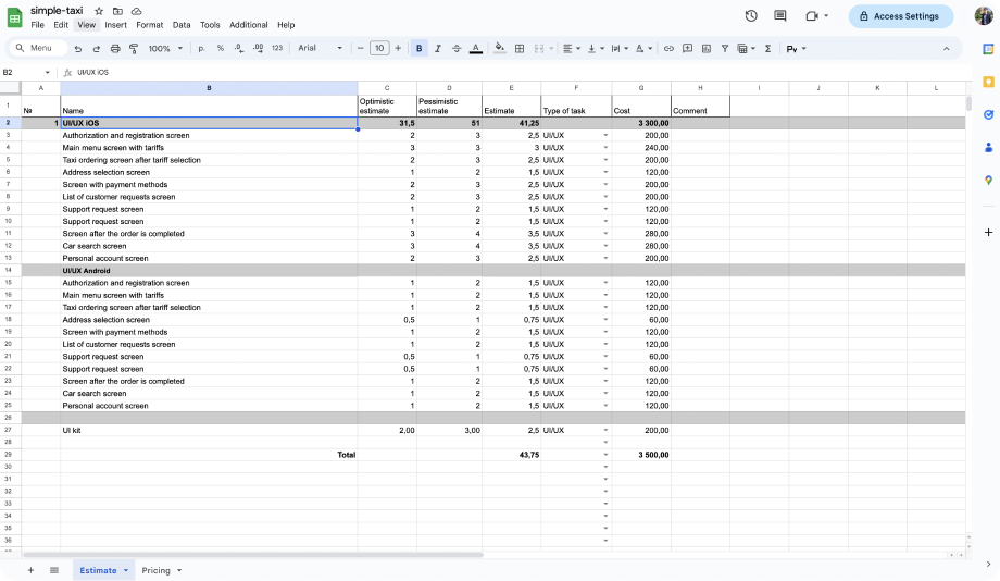 Based on the tech task, we make a list of tasks, divide them into stages, and realistically estimate the number of hours. With this estimate, you can't go over budget.